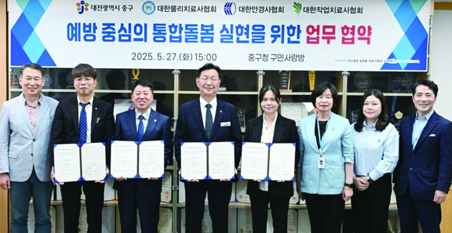 대전 중구에 따르면 이번 협약은 대전시안경사회를 비롯해 대한물리치료사협회 대전광역시회, 대한작업치료사협회 충청지부와 진행한 이번 협약은 지역내 다양한 건강위험 요인을 조기에 발견하고, 각 보건의료 분야의 전문성을 공유함으로써 돌봄 수요를 줄이고 주민들의 건강한 생활 유지를 도모하기 위해 추진됐다.