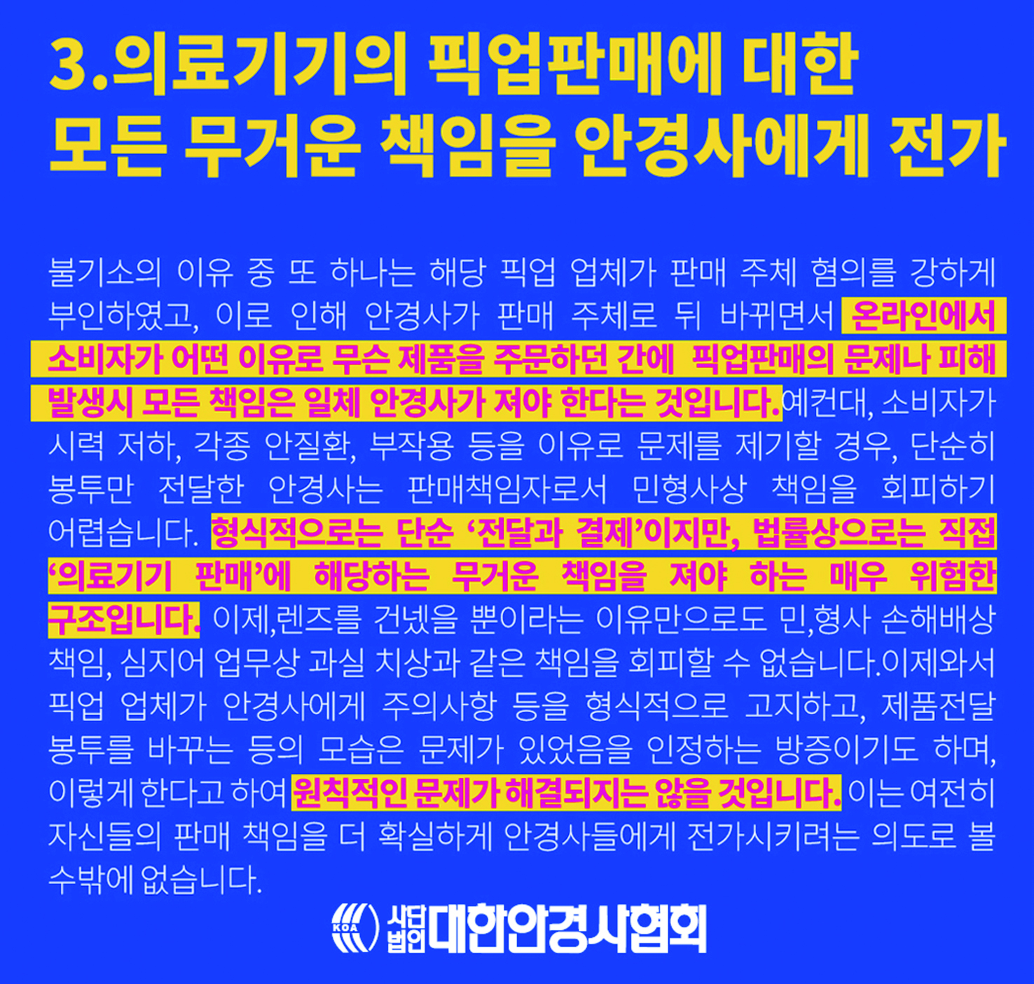 검찰 또한 “검안 없이 제품 봉투만을 전달하는 행위는 문제의 소지가 있다”고 지적한 바 있다. 업계에서는 이 구조가 안경사에게 일방적으로 책임을 떠넘기는 위험한 방식이라는 점에서 우려를 나타내고 있다. 소비자가 온라인을 통해 어떤 제품을 어떤 이유로 주문했든, 결국 제품을 전달한 안경사가 모든 법적 책임을 감당해야 하는 구조이기 때문이다. 특히 단순 전달에 불과했더라도 민·형사상 책임까지 발생할 수 있는 상황이 충분히 예상된다.