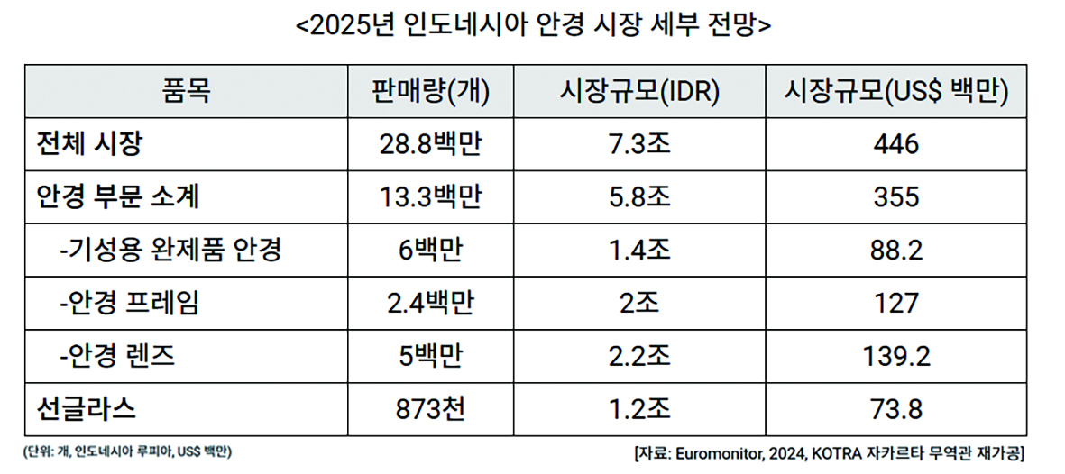 정 무역관은 또 인도네시아는 가격 민감도가 높은 시장으로 현지 맞춤형 제품군과 가격 전략 개발, 로컬 생산·조립을 통해 가격 경쟁력을 확보할 필요가 있다. 최근에는 안경원 체인이나 기업복지 프로그램 운영 기업과의 제휴가 활발해지는 만큼 다양한 유통망을 활용한 마케팅 전략도 고려해 볼 수 있다고 전했다.