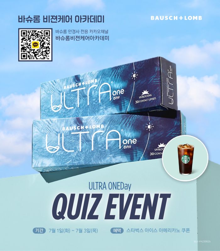 퀴즈 이벤트 주제는 바슈롬 투명렌즈 ‘울트라 원데이(ULTRA ONEDay)’ 렌즈에 대한 내용이다. 바슈롬 거래 안경원에서 근무하는 안경사라면 누구나 쉽게 참여할 수 있으며, 퀴즈 정답자 선착순 200명에게 ‘스타벅스 아이스 아메리카노’ 모바일 쿠폰을 증정할 예정이다.