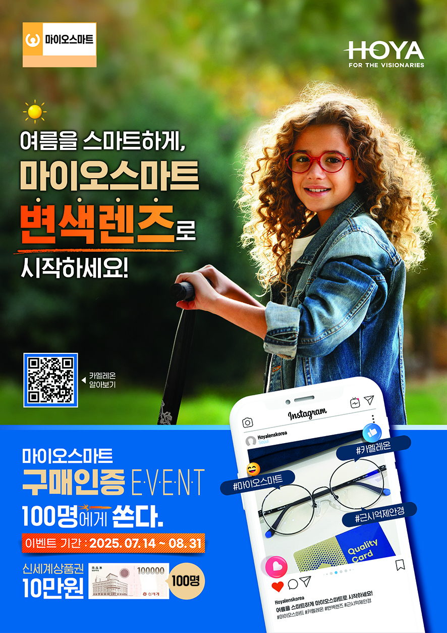 한국호야렌즈(대표 정병헌)가 아이들 근시 진행 억제에 도움을 주는 기능성 안경렌즈 ‘마이오스마트’에 대한 소비자 관심과 인식을 제고하기 위해 여름방학 시즌을 맞아 소비자 대상 ‘마이오스마트 구매인증 이벤트’를 진행한다고 최근 밝혔다.
