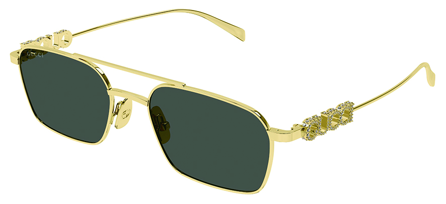 구찌의 ‘GG1804S’ 모델은 슬림한 메탈 프레임의 카라반 선글라스로, 더블 브릿지 디테일과 템플에 장식된 입체적인 크리스탈 구찌 로고가 특징이다.