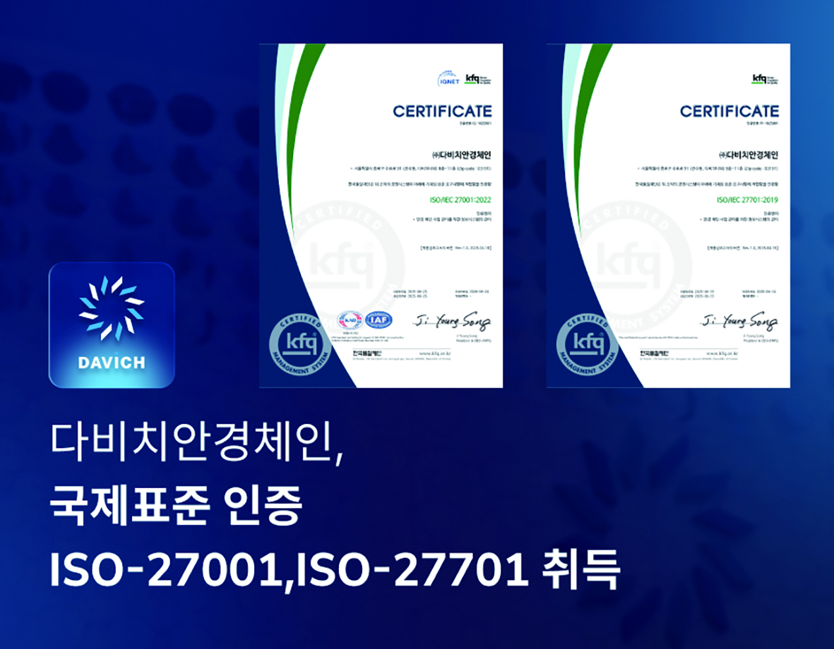 다비치안경이 국제표준화기구(ISO)가 제정한 정보보호 관리체계 국제표준 중 ISO-27001, ISO-27701 인증을 취득했다고 최근 밝혔다.