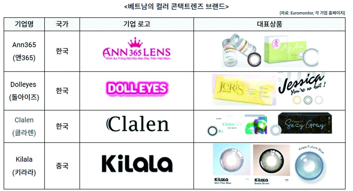 베트남 컬러 콘택트렌즈 시장에서는 한국 브랜드의 존재감이 더욱 두드러진다. 특히 Ann365(앤365), Dolleyes(돌아이즈), Clalen(클라렌)과 같은 브랜드는 다양한 색상과 이미지로 현지 젊은 소비자들 사이에서 인기를 끌고 있다. 이들 브랜드는 K-뷰티 트렌드와 함께 ‘자연스러우면서도 또렷한 눈매’를 연출해주는 이미지 마케팅을 강조하고 있으며, SNS를 중심으로 높은 확산력을 보이고 있다. 한편, 중국 브랜드인 Kilala(키라라) 또한 가격 경쟁력을 기반으로 시장 내 점유율을 확대하고 있으며, 기본 컬러부터 트렌디한 스타일까지 다양한 라인업을 선보이고 있다.