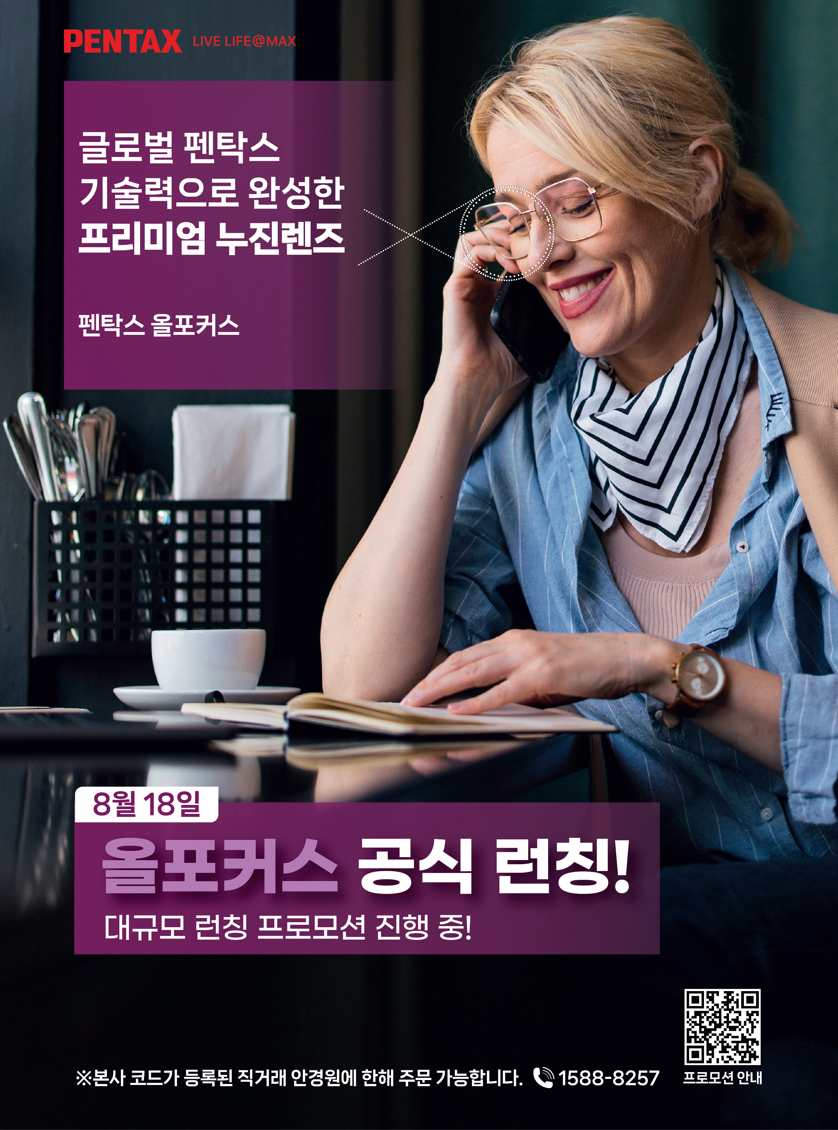 펜탁스 관계자는 “올포커스는 글로벌 기술력과 소비자 맞춤 설계가 결합된 프리미엄 누진렌즈다. 다양한 소비자 생활 패턴에 맞는 시야 솔루션을 제공하기 위해 론칭하게 됐다”며 “신제품 출시와 함께 진행하는 프로모션을 통해 더 많은 안경원이 펜탁스 올포커스의 차별화된 품질을 경험하고, 소비자들에게 자신 있게 추천할 수 있기를 기대한다”고 밝혔다.