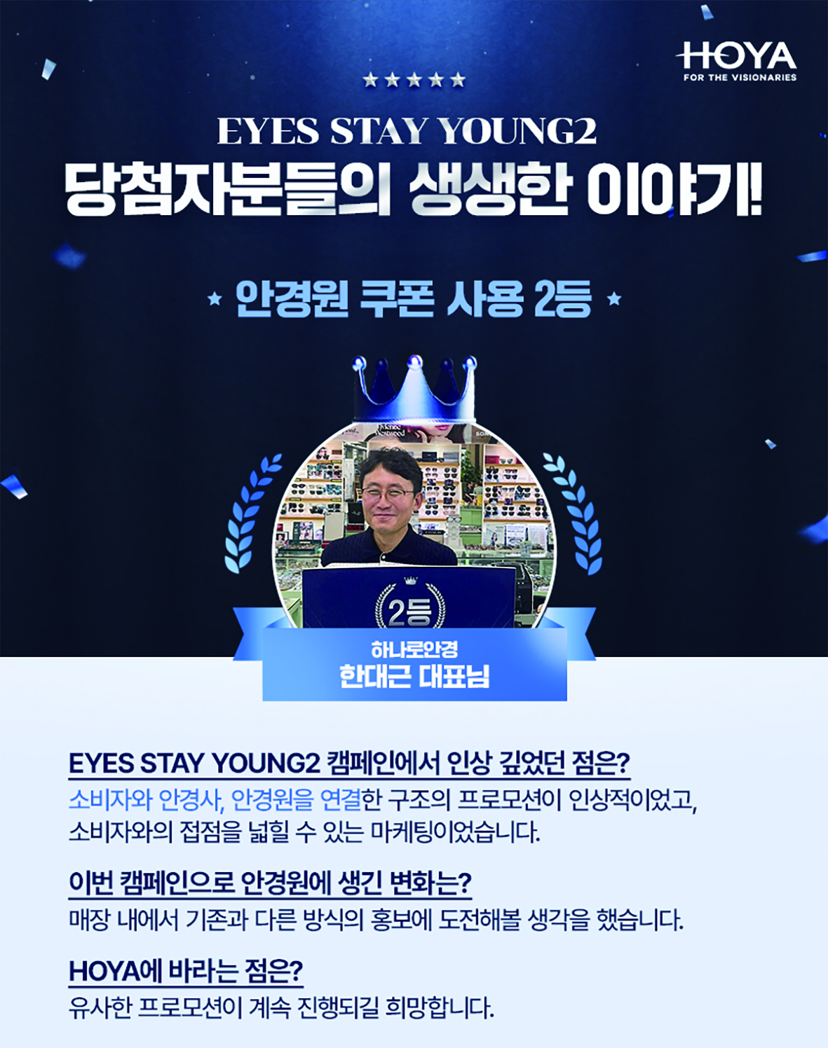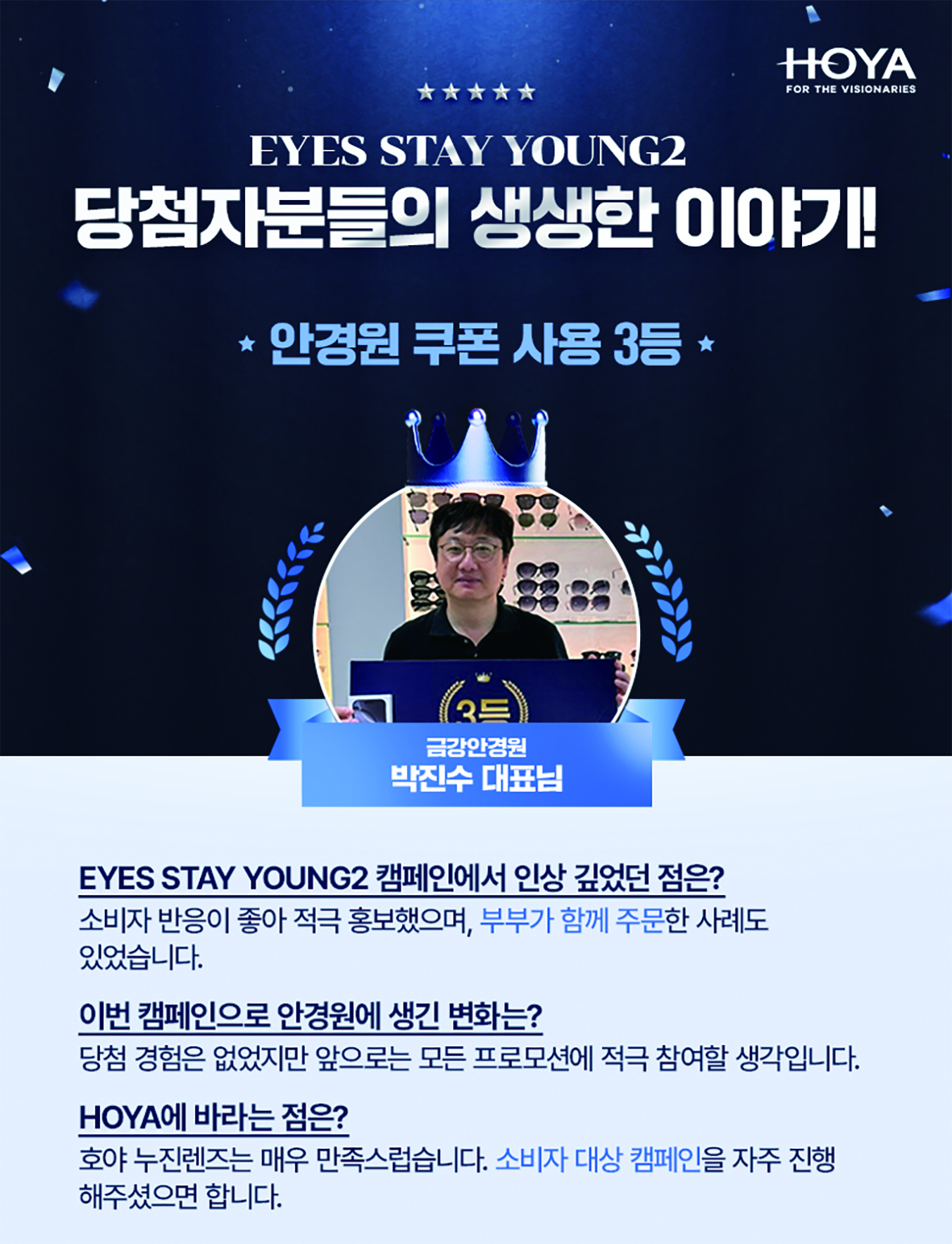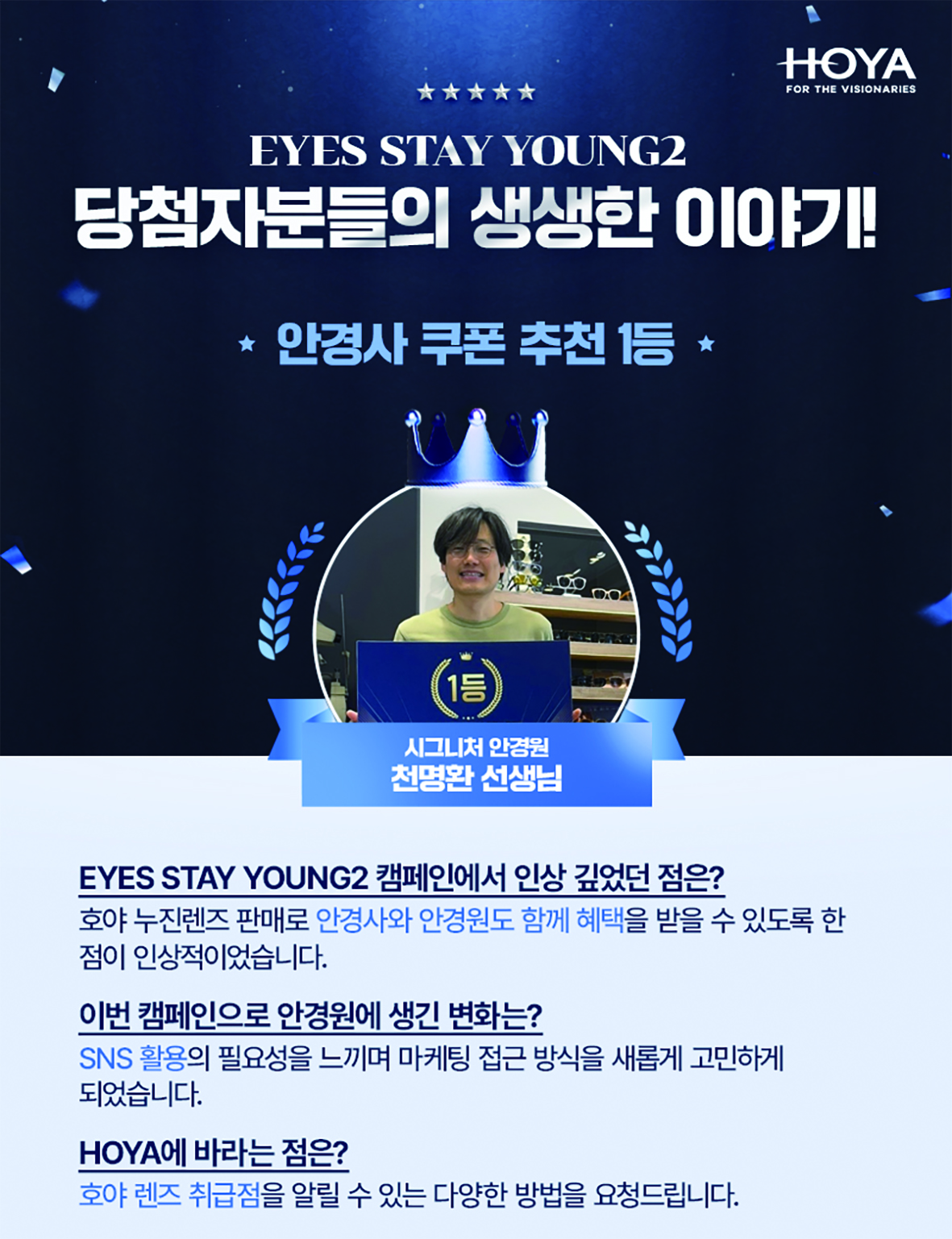 한국호야렌즈(대표 정병헌)가 지난 상반기 동안 진행한 ‘EYES STAY YOUNG2’ 소비자 프로모션을 성황리에 마무리했다고 최근 전했다.