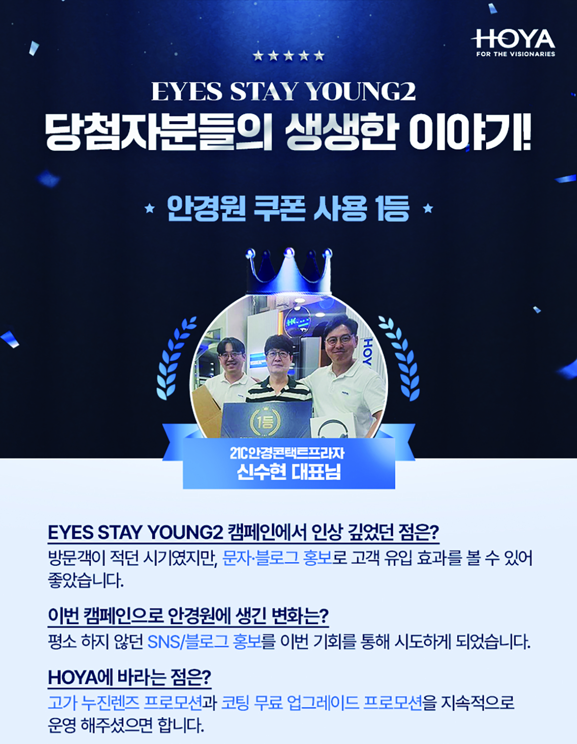 한국호야렌즈 관계자는 “이번 ‘EYES STAY YOUNG2’ 캠페인을 통해 안경사, 안경원, 소비자 간의 연결 고리를 더욱 강화하고자 했다”며 “앞으로도 안경사 분들의 믿을 수 있는 파트너로서 공고한 신뢰를 바탕으로 지속 가능한 성장과 상생을 위해 늘 최선을 다하겠다”고 포부를 전했다.