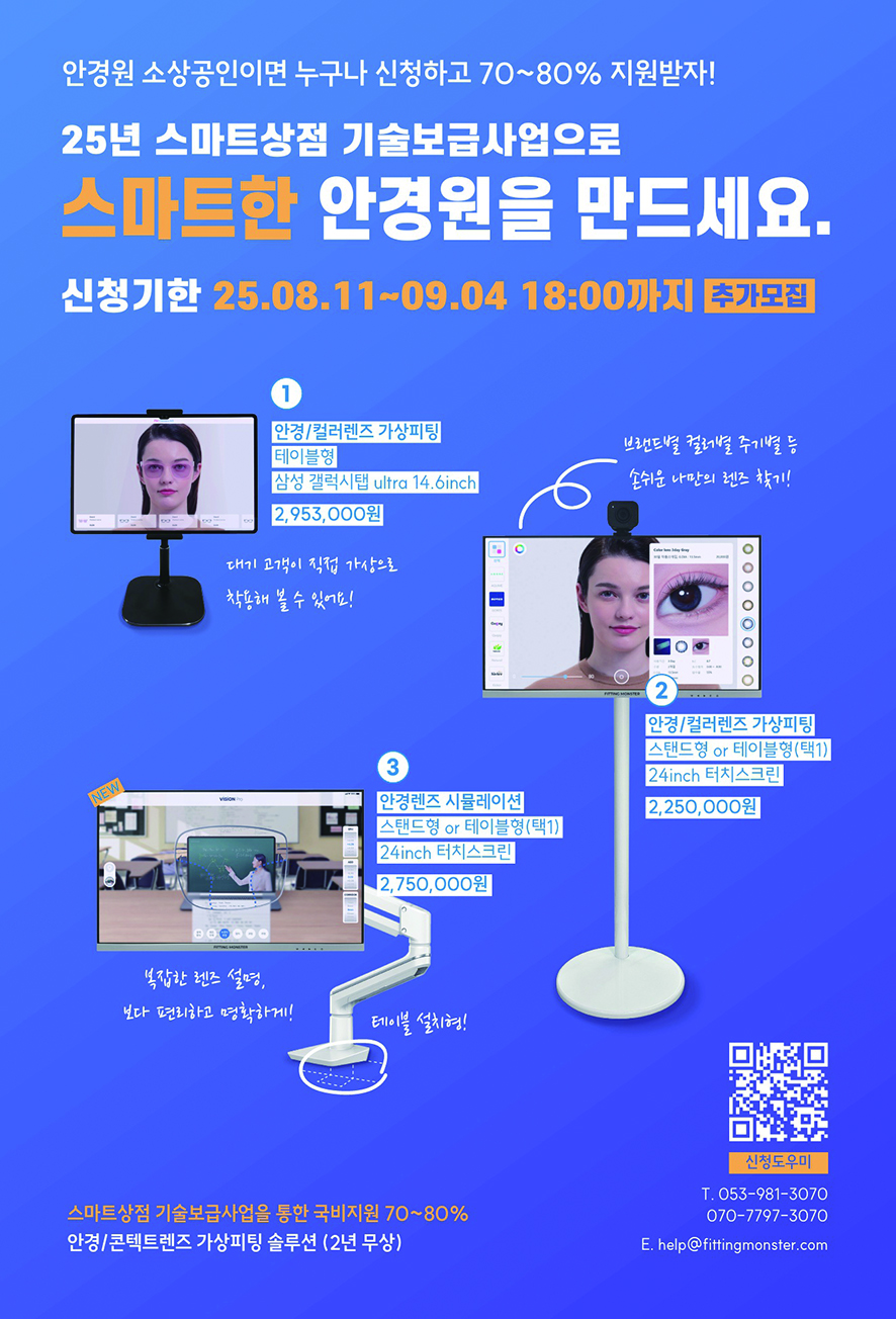 안경 및 콘택트렌즈 가상피팅 기술을 공급하고 있는 안경업계 혁신기업 선두주자 인터비젼(대표 김재윤)이 내달 4일까지 2025년도 스마트상점 기술보급사업 참가 안경원을 모집한다.