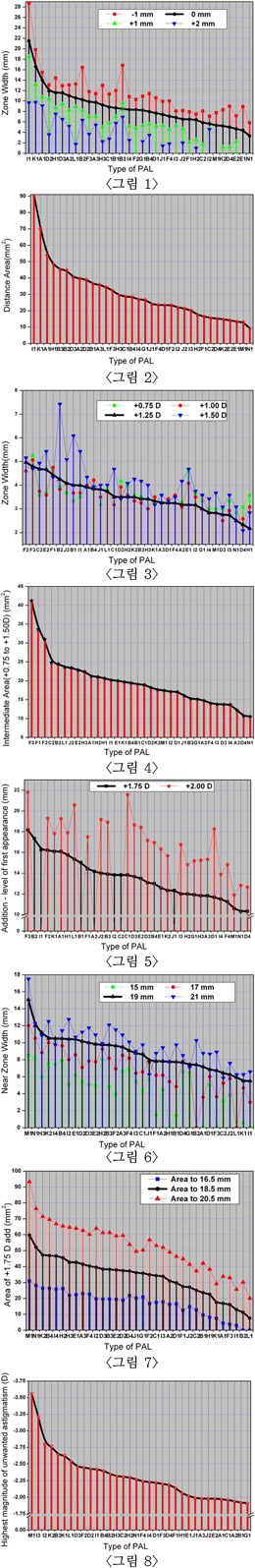 fig. 7은 가입도 +0.75d에서 +1.50d까지 중간거리부 명시범위의 면적을 가장 넓은 렌즈부터 순서대로 정렬한 것이다.