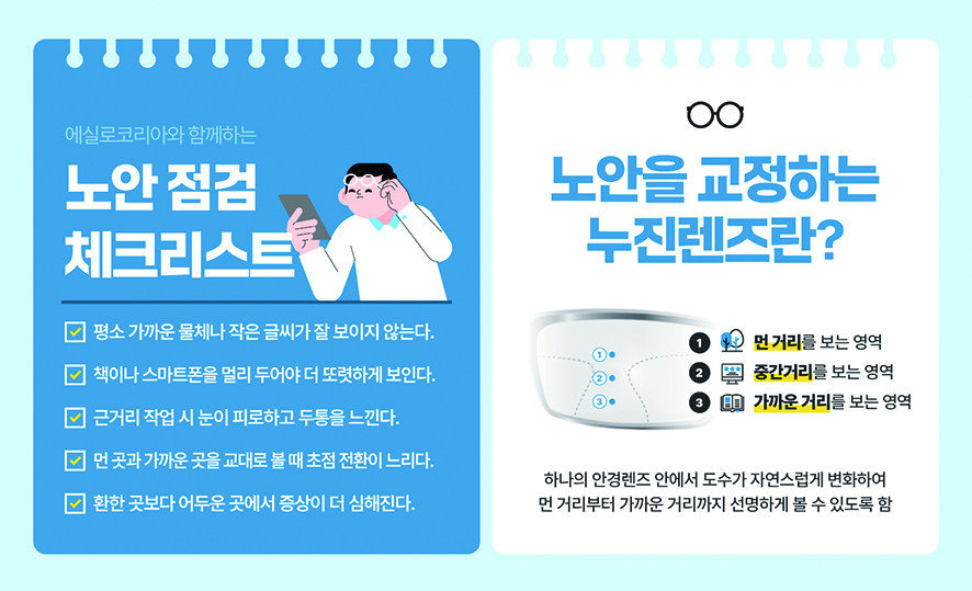 에실로코리아는 이번 활동의 일환으로 노안 자가진단 체크리스트와 함께 노안 관리를 위한 누진렌즈의 원리를 알기 쉽게 소개했다. 노안 체크리스트에는 △평소 가까운 물체나 작은 글씨가 잘 보이지 않는다 △책이나 스마트폰을 멀리 두어야 더 또렷하게 보인다 △근거리 작업 시 눈이 피로하고 두통을 느낀다 △먼 곳과 가까운 곳을 교대로 볼 때 초점 전환이 느리다 △환한 곳보다 어두운 곳에서 증상이 더 심해진다 등이 포함됐으며, 이 가운데 3가지 이상에 해당된다면 노안 검사를 권장한다.
