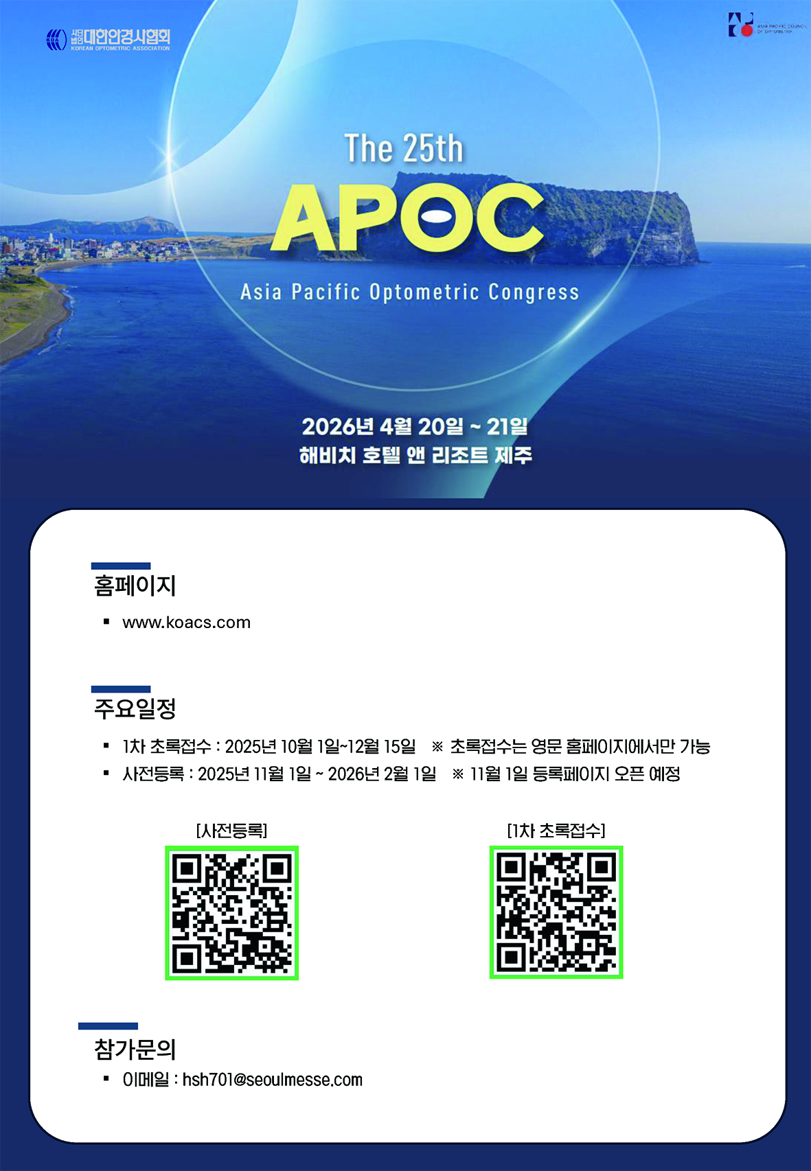 제25회 아시아·태평양 검안학술대회(APOC·Asia Pacific Optometric Congress)가 내년 4월20일과 21일 양일간 제주 해비치 호텔앤리조트에서 열린다. 이번 학술대회는 아시아태평양검안협의회(APCO)와 (사)대한안경사협회(협회장 허봉현·이하 대안협)가 공동 주최하며, 국내 안경사와 업계 전문가뿐만 아니라 아시아·태평양 지역의 검안사, 학계 및 업계 관계자 등 약 600여명이 참여할 예정이다.