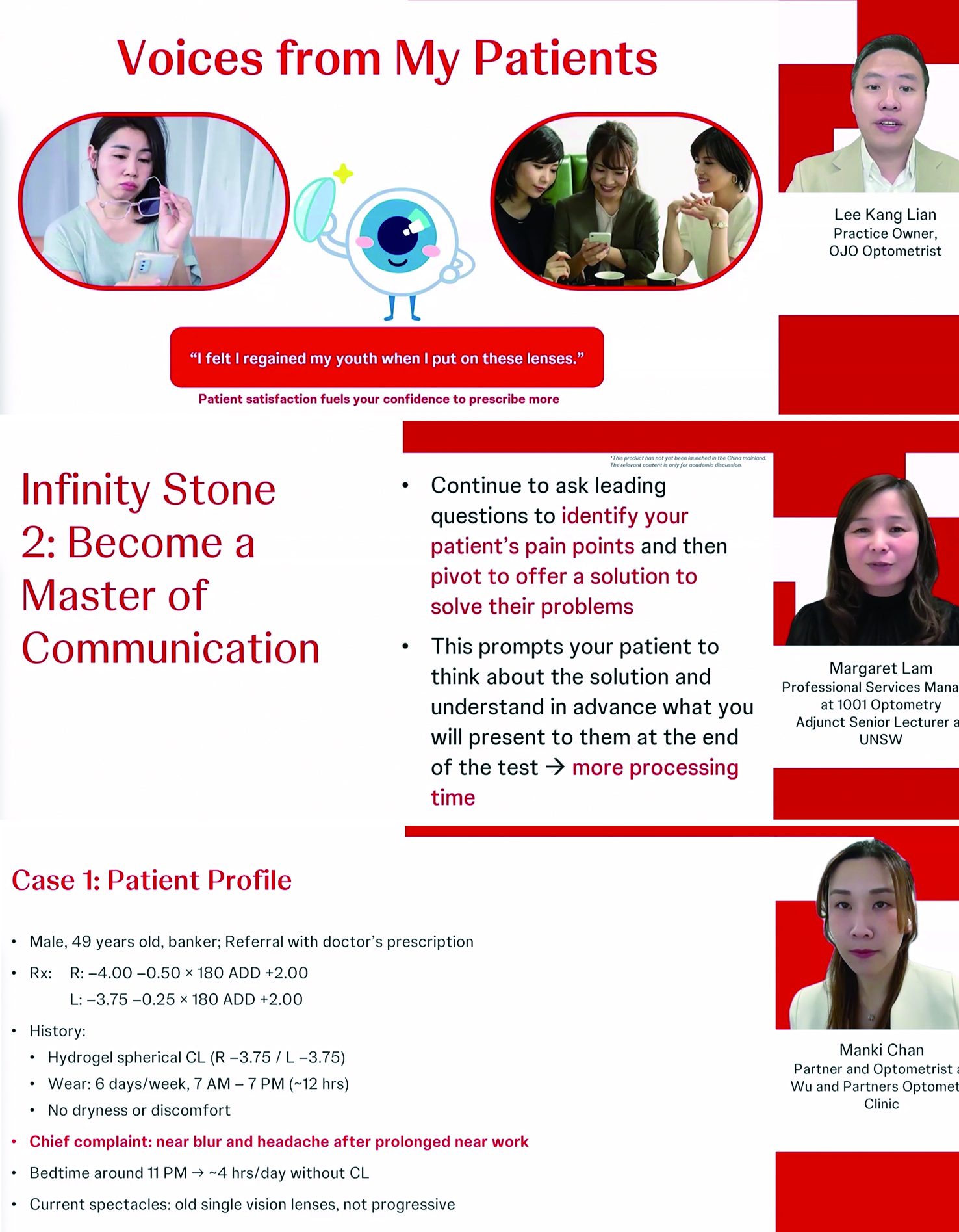 이어 Margaret Lam 검안사는 멀티포컬 렌즈를 마스터하기 위해 영화 앤드게임에서 타노스가 5개의 돌을 수집하듯 5가지 핵심포인트를 공유했다. 그녀는 25년간 검안사로 일하면서 멀티포컬 렌즈의 성공적인 피팅을 위한 많은 성찰을 바탕으로 전문지식을 전달했다.