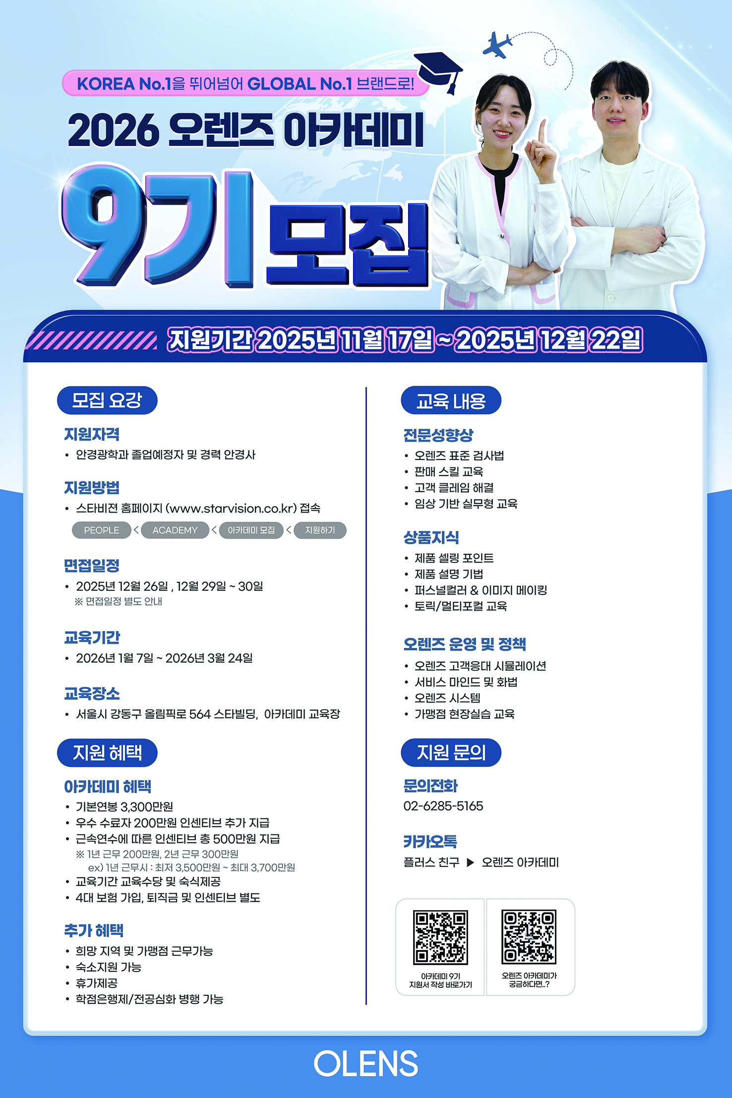 이번 9기생은 총 60명을 선발하며 안경광학과 졸업생 및 졸업예정자, 안경사 면허 소지자라면 전국 각지에서 지원할 수 있다.