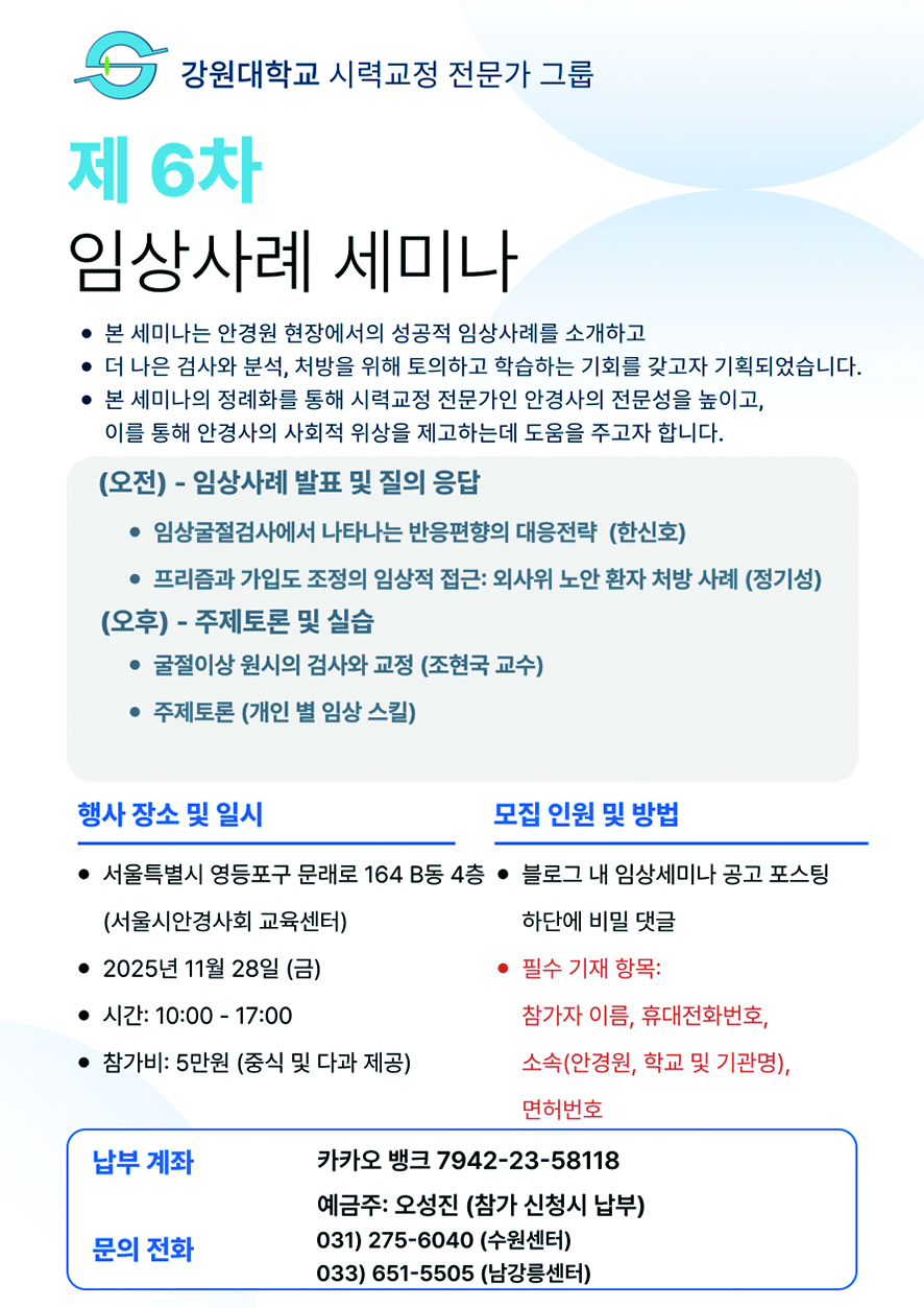 6차 세미나 오전에 열리는 임상사례 발표는 한신호 강사의 ‘임상굴절검사에서 나타나는 반응편향의 대응전략’과 정기성 강사의 ‘프리즘과 가입도 조정의 임상적 접근:외사위 노안 환자 처방 사례’라는 주제로 진행되며, 오후에는 조현국 교수의 ‘굴절이상 원시의 검사와 교정’이라는 주제로 열린다.