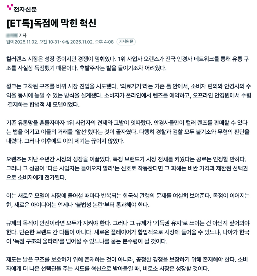 해당 기사의 내용을 보면 독점업체가 후발 주자의 혁신을 막고 있다는 취지로 쓰여있다. 그렇다면 윙크에서 선보인 혁신은 무엇일까. 바로 온라인에서 소비자가 렌즈를 주문하고 오프라인 안경원에서 수령·결제하는 합법적인 새 모델이라는 주장이다.