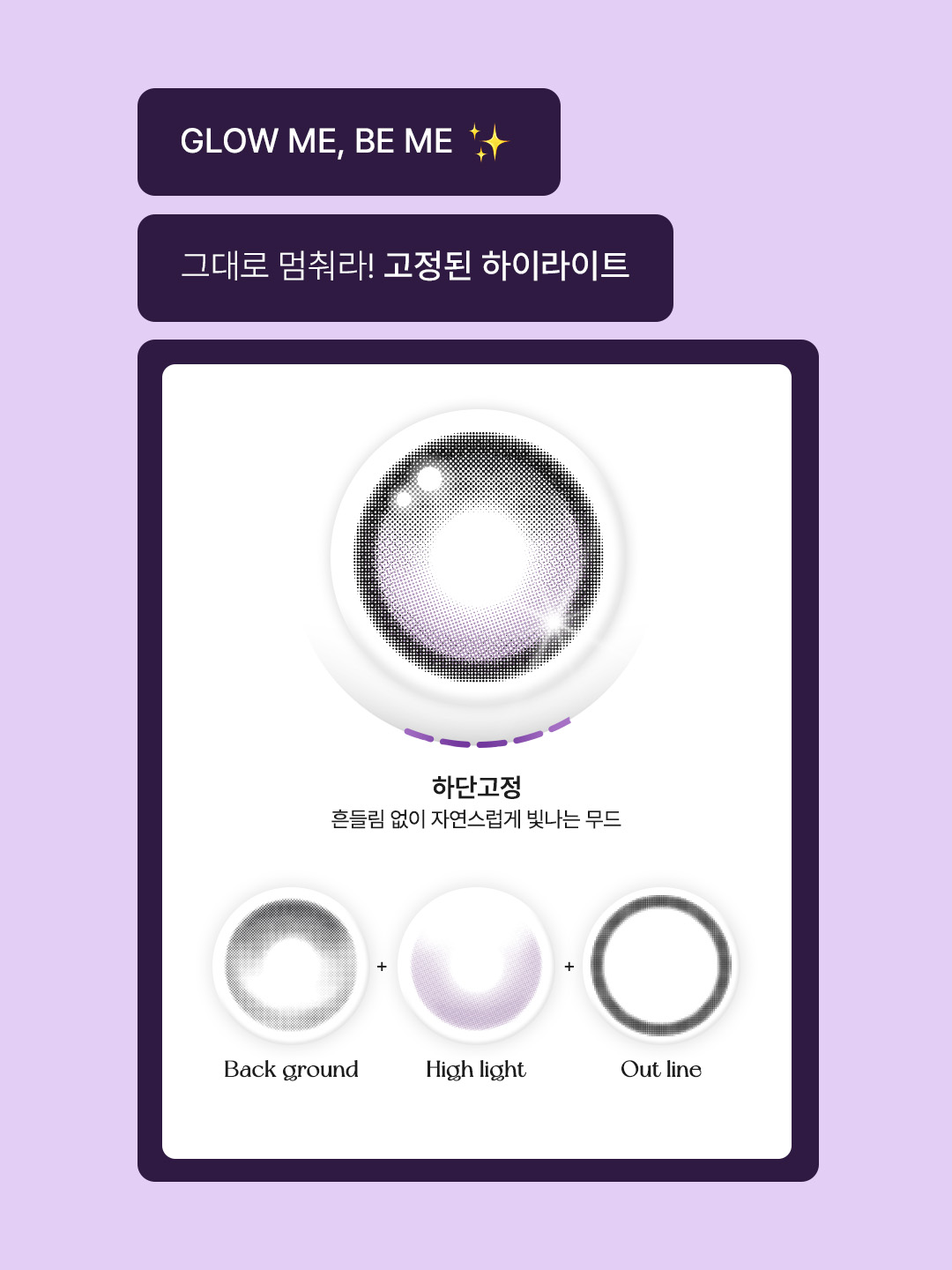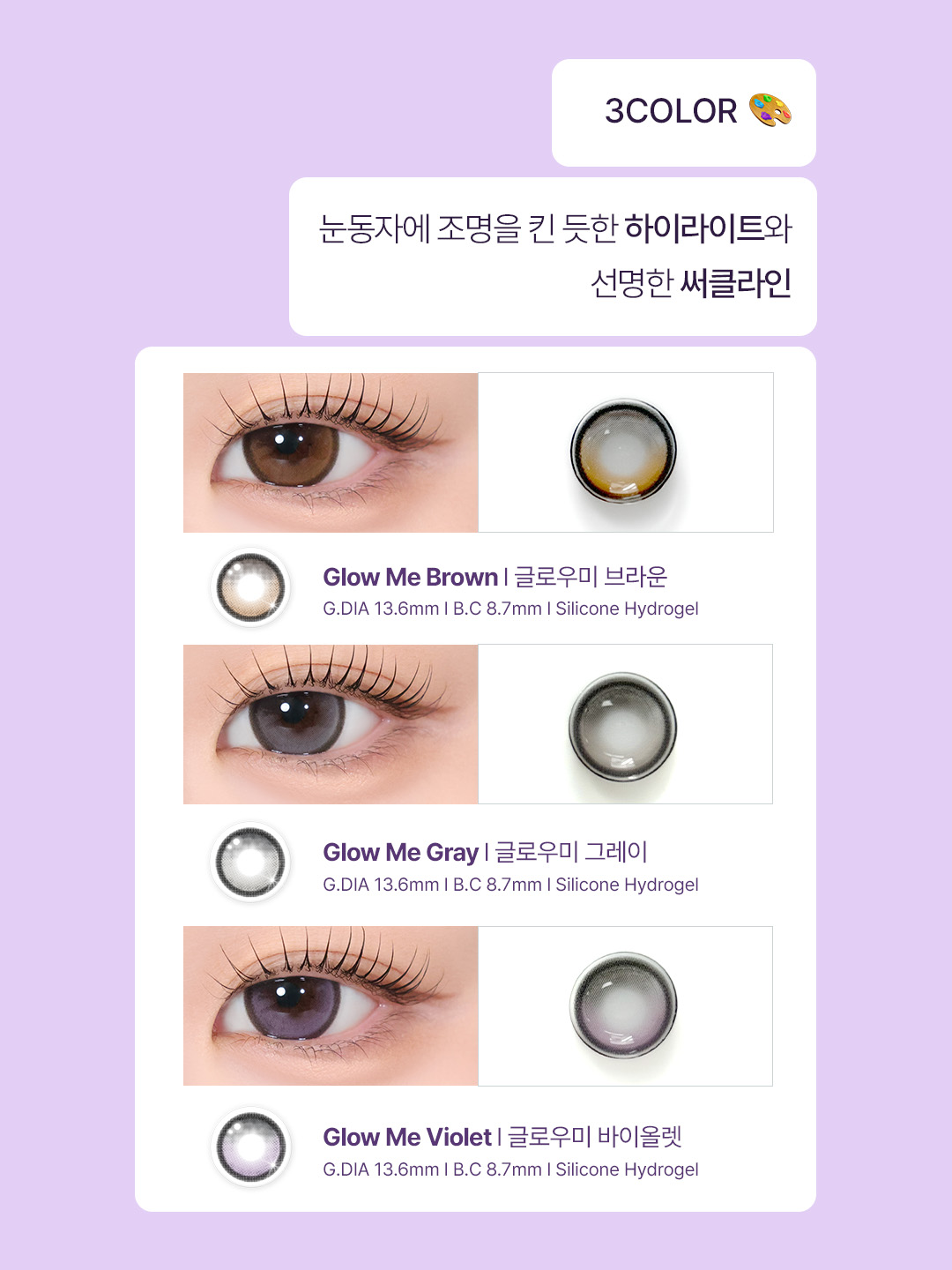 글로우미의 감각적이고 트렌디한 컬러는 착용자의 눈빛을 더욱 돋보이게 해준다. 브라운은 따뜻하고 부드러운 인상으로 자연스러운 음영감을 더하며, 그레이는 도시적인 세련미와 청량한 눈빛을 연출한다. 바이올렛은 은은하면서도 영롱한 포인트로 특별한 매력을 완성한다. 각 컬러는 그래픽 직경 13.6mm이며, 과하지 않으면서도 또렷한 눈빛을 연출한다.