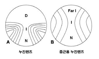 일반누진렌즈와 중근용 누진렌즈의 가장 큰 차이점이라 하면, 누진렌즈의 원용도수 부분에 +0.50∼+0.75d 의 흐림을 의도적으로 가입하여 착용자가 원용도수가 아닌 중간대가 되도록 하는 것이다. 하지만 중근용 누진렌즈의 설계에 따라 업체마다 다를 수 있기 때문에 이러한 부분을 정확히 확인해야 한다.
