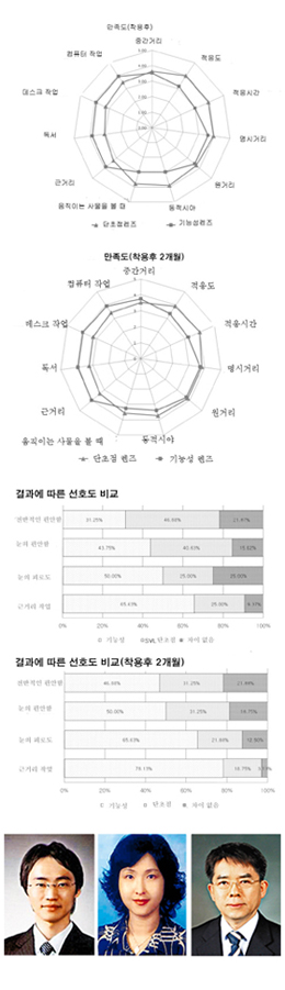 또한 선호도를 비교해 보면 가장 큰 선호도를 보인 근거리 작업의 경우는 75.00%에서 81.26%, 시각적 피로감은 50.00에서 65.63%, 시각적 편안함은 47.75%에서 50.00%, 전반적인 편안함은 31.25%에서 46.88%로 모든 항목이 증가한 것을 볼 수 있었다. 이러한 만족도 및 선호도는 2003∼2004년도 anglia polytechnic university (uk)에서 시행한 선행연구와 비슷한 결과를 보이고 있다.