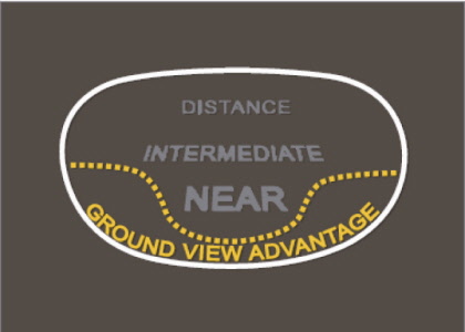 그라운드 뷰 설계란 근거리 시야 영역 아래 발생하는 비점 수차를 최소화하기 위해 부점수차와 가입도 양에 따라 최소 0.12d에서 최대 0.75d 사이의 도수를 재배열하여 일그러짐 없는 그라운드 뷰 시야를 제공한다. 따라서 근거리 시야 영역에도 역동적인 시야를 제공하여 야외 활동, 특히 골프를 즐기는 소비자에게도 각광받고 있다.