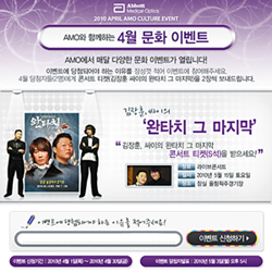 아이케어 전문업체인 amo(abbott medical optics)는 4월의 문화이벤트로 ‘김장훈 싸이의 완타치’콘서트 티켓을 증정하는 이벤트를 전개한다.