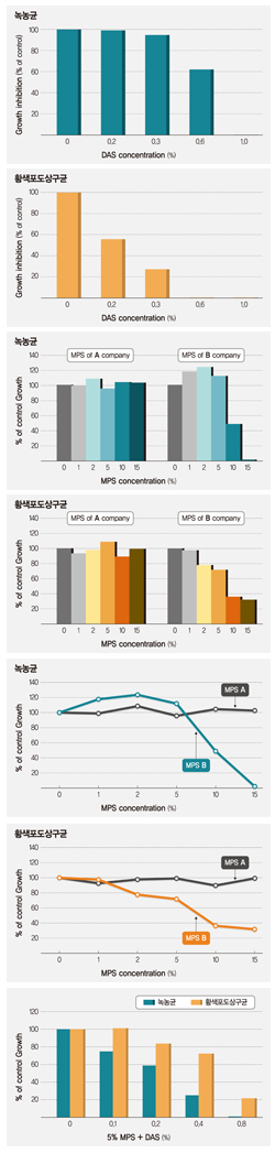 마늘유래 allyl 유도체인 das는 황색포도상구균과 녹농균 모두에서 더욱 강한 항균활성을 나타냈으며, 특히 녹농균에서 항균활성도가 높았다. mps의 항균활성 실험에서 a사 제품은 희석하였을 때 항균효과가 없었으며 b사 제품은 두 균 모두에서 동일한 항균활성을 보였다. mps에 첨가된 das 역시 항균활성을 나타내었다. 따라서 마늘성분과 같은 천연물유래 das가 더욱 효과적이고 안전한 mps의 보존제로 개발 가능성이 있음을 시사한다.