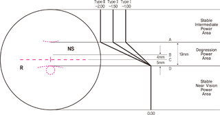 중근용 누진 가입도 렌즈는 측정된 가입도를 기준으로 soltes(nikon co.) ⅰ형(가입도 +1.50∼+2.00d)과 ⅱ형(가입도 +2.00∼+2.50d)을 나누어 처방하였다. 가입도가 +1.25∼+1.75d인 경우 ⅰ형을 처방하고 +2.00∼ +2.50d는 ⅱ형을 처방하였다. ⅰ형은 누진대의 가입도 변화량이 1.00d이고 ⅱ형은 1.50d이며, 누진대의 길이는 모두 19mm이다(fig. 1).