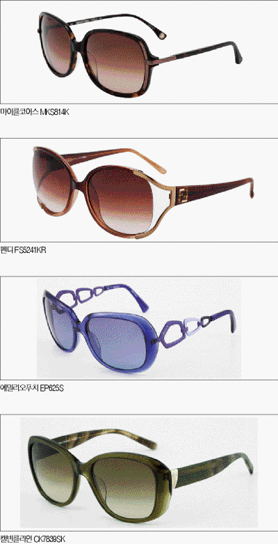 또한 하얀 피부에 귀여운 스타일을 추구하는 여성에게는 민트나 은은한 파스텔 계열 또는 시원한 느낌의 투명 블루 컬러가 잘 어울린다. 특히 블루 계열의 선글라스는 여름철 해변가는 물론 도심에서도 시원해 보이기 때문에 여름을 준비하는 패셔니스타에게 필수 아이템이다. 블루 계열의 선글라스를 선호하는 여성들에게는 에밀리오푸치의 ep625s를 추천한다. 부드럽게 처리된 스퀘어 스타일의 안구에 독특하게 표현된 템플(안경다리)이 특징이다.