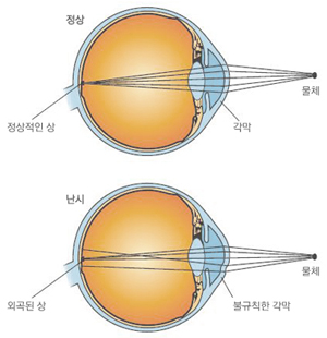 사람의 눈은 태어날 때 완전한 공 모양을 한 각막을 가지고 태어난다. 그러나 태어나서부터 4∼5살이 될 때까지 각막은 약간 평면에 가까운 공 모양으로 변형된다. 이 때 수직방향에서 들어오는 빛이 더 강하게 굴절하여 초점이 안 맞아 흐리게 보이는 상태가 되는데, 이러한 경우를 ‘직난시(直亂視)’라 한다. 직난시의 경우 대부분 나이가 들면서 줄어드는 경향을 보인다.