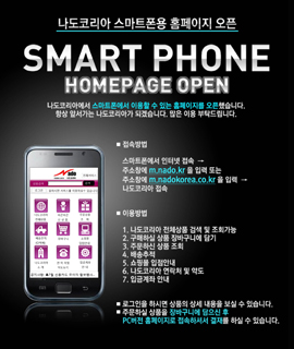 접속방법은 스마트 폰 내에 웹 브라우져에서 m.nado.kr 또는 m.nadokorea.co.kr을 입력하면 된다. 페이지에는 상품 검색 및 조회, 구매를 원하는 상품을 장바구니에 담을 수 있다. 또한, 배송추적과 쇼핑몰 입점 안내, 입금계좌, 나도코리아 연락처 및 약도 등등의 정보를 확인 할 수 있다.