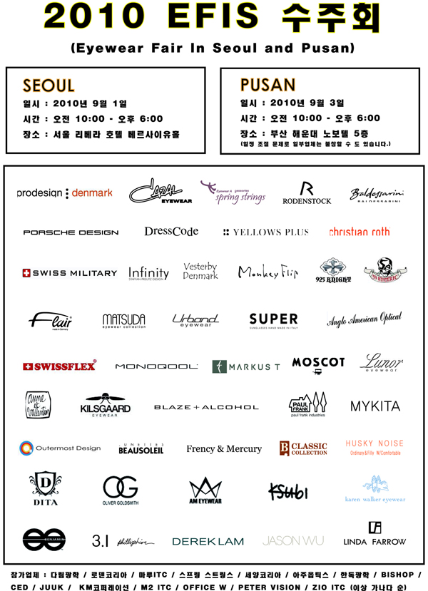 한편 efis에 참가한 모든 업체들은 2010년 가을 컬렉션을 선보일 예정이기에 안경사들의 많은 관심과 사랑을 받을 것으로 보이며, 특히 올해는 9월 3일에 처음으로 부산의 해운대 노보텔호텔 5층에서 수주회(사정상 몇 개 업체는 불참)를 개최하는 등 점차 수주회 영역을 확대해 나갈 계획인 것으로 알려졌다.