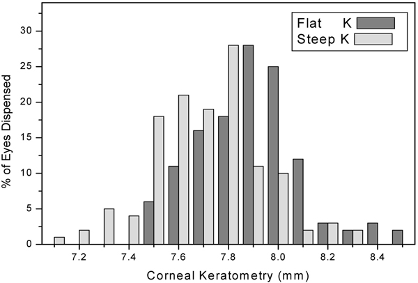dumbleton 등‘22’은 소프트 콘택트렌즈 착용자에게 night & day 실리콘 하이드로겔렌즈로 바꿔 착용시킨 결과 93%의 성공률을 보였다고 보고하였는데 본 연구에서는 연구기간 동안 콘택트렌즈를 성공적으로 착용한 경우가 95.4%로 dumbleton 등과 유사한 결과를 얻었다. o2optix 실리콘 하이드로겔렌즈는 하나의 베이스커브(8.6mm) 만 제공되는 렌즈지만 피팅 성공률이 98%로 한국 성인에서 각막 곡률반경값에 관계없이 성공적인 피팅 상태를 보일 수 있는 one-fit lens로 생각되며 소프트 콘택트렌즈보다 모듈러스가 큰 실리콘 하이드로겔 재질의 렌즈에서도 단일커브로 90% 이상의 피팅 성공률을 보일 수 있다는 것을 확인하였다.