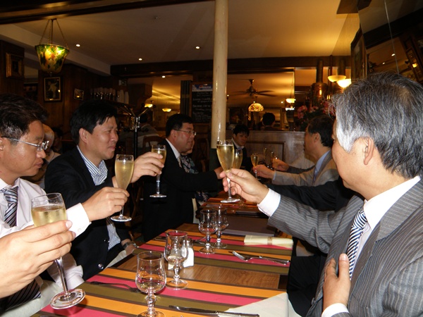 "자 모두 고생하셨습니다." 한국 오지케이 박수안 회장이 한국 참가자들을 격려하기위 저녁에 만찬의 자리를 주선하였다. 이상민코비스 옵틱 대표(왼쪽 첫번째), 황창호 블릭 대표(왼쪽 두번째), 정영환 씨월드 대표(오른쪽) 등이 참가하여 샴페인을 건배하고 있다.