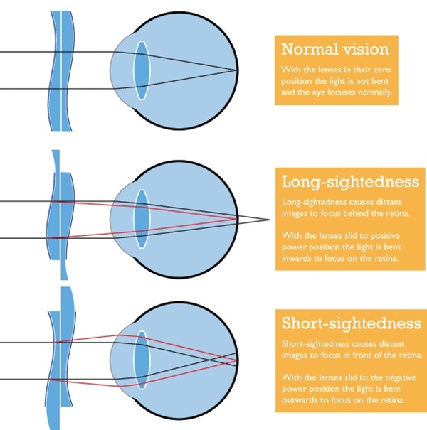 이번 도수조절 렌즈는 기존 액체 안경과 같이 원리는 간단하다. 마치 slr카메라의 파인더의 초점 조절처럼 물결무늬로 생긴 두 개의 렌즈를 양 옆으로 이동시키면서 원시용인 볼록렌즈, 근시용인 오목렌즈로 변환하여 자기의 도수에 맞출 수 있다.