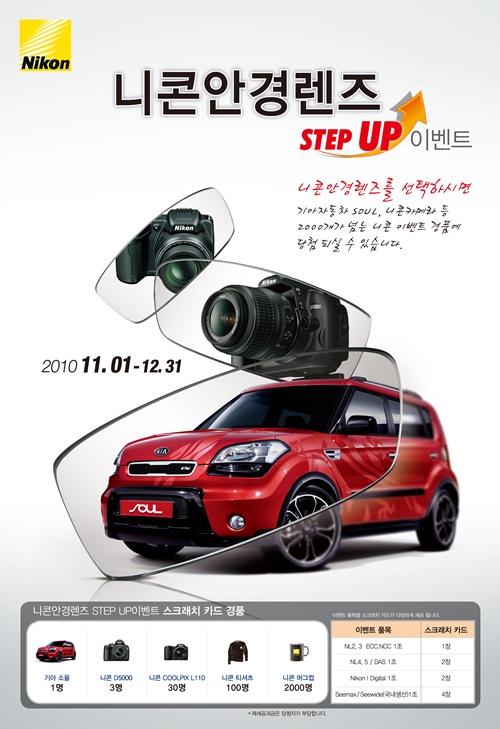 니콘 스텝업 이벤트는 니콘의 브랜드, 특히 최신 기술이 적용된 니콘 제품으로 스텝업을 통해 시력에 대한 만족도를 높일 뿐만 아니라 스크레치 제공을 통해 경품도 당첨될 수 있는 기대되는 이벤트로 기획되었다.