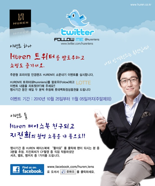페이스북 이벤트는 휴렌 광고 촬영시 전속모델 지진희가 직접 착용했던 소품을 증정할 예정이다. 휴렌 페이스북(www.facebook.com/huren.lens)에 가서 ‘좋아요’ 버튼을 눌러 펜으로 등록하면 자동응모 된다.